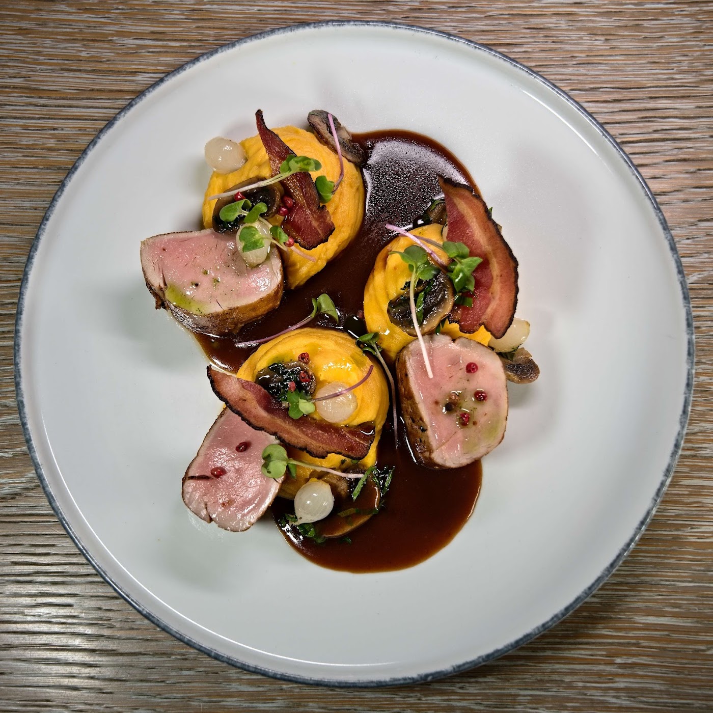 - Kuřecí prsíčko pečené s kůží a grilovaná sezónní zelenina s vařeným bramborem.