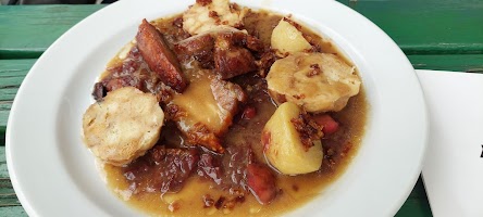 - Pivní guláš s bramboráčky.