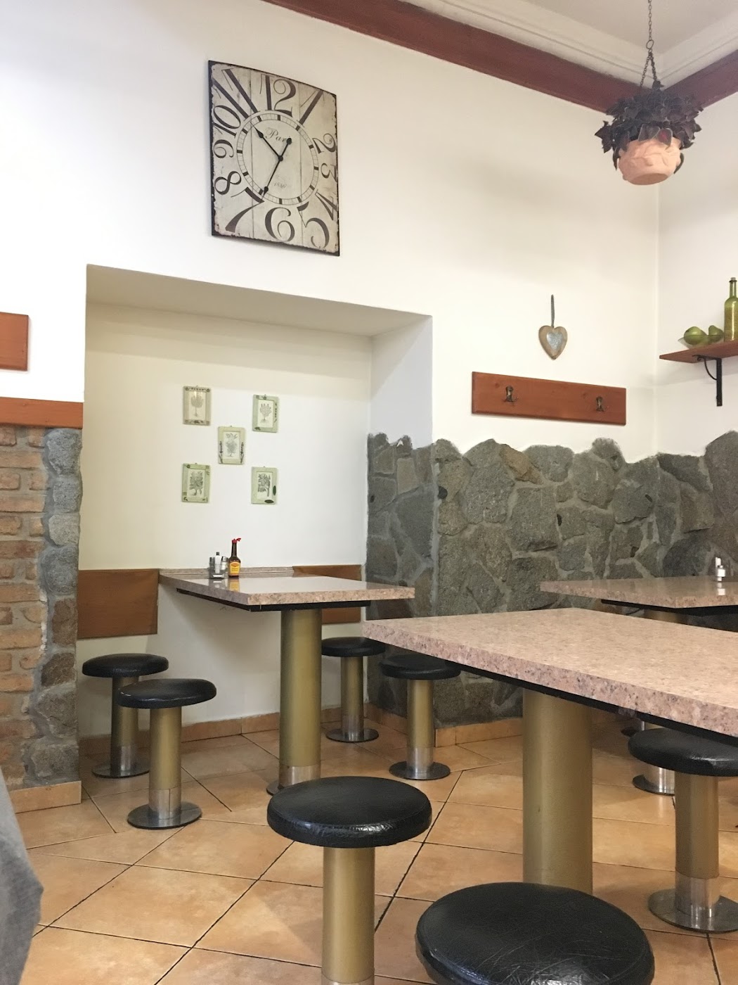 - Starší zařízení a kuchyně, do které je vidět zákazníky.