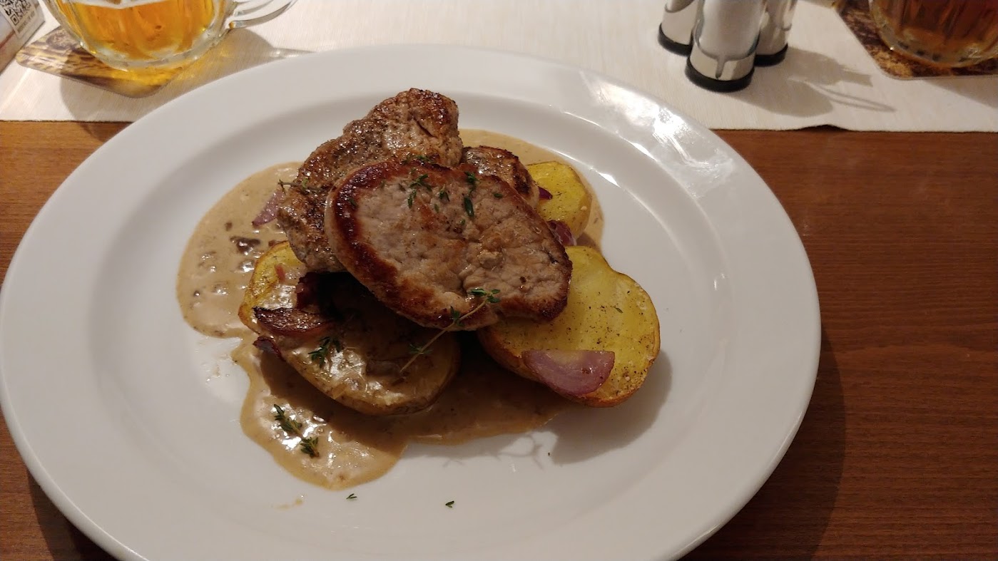 - Vepřové medailonky s hříbkovou smetanovou omáčkou a pečeným bramborem