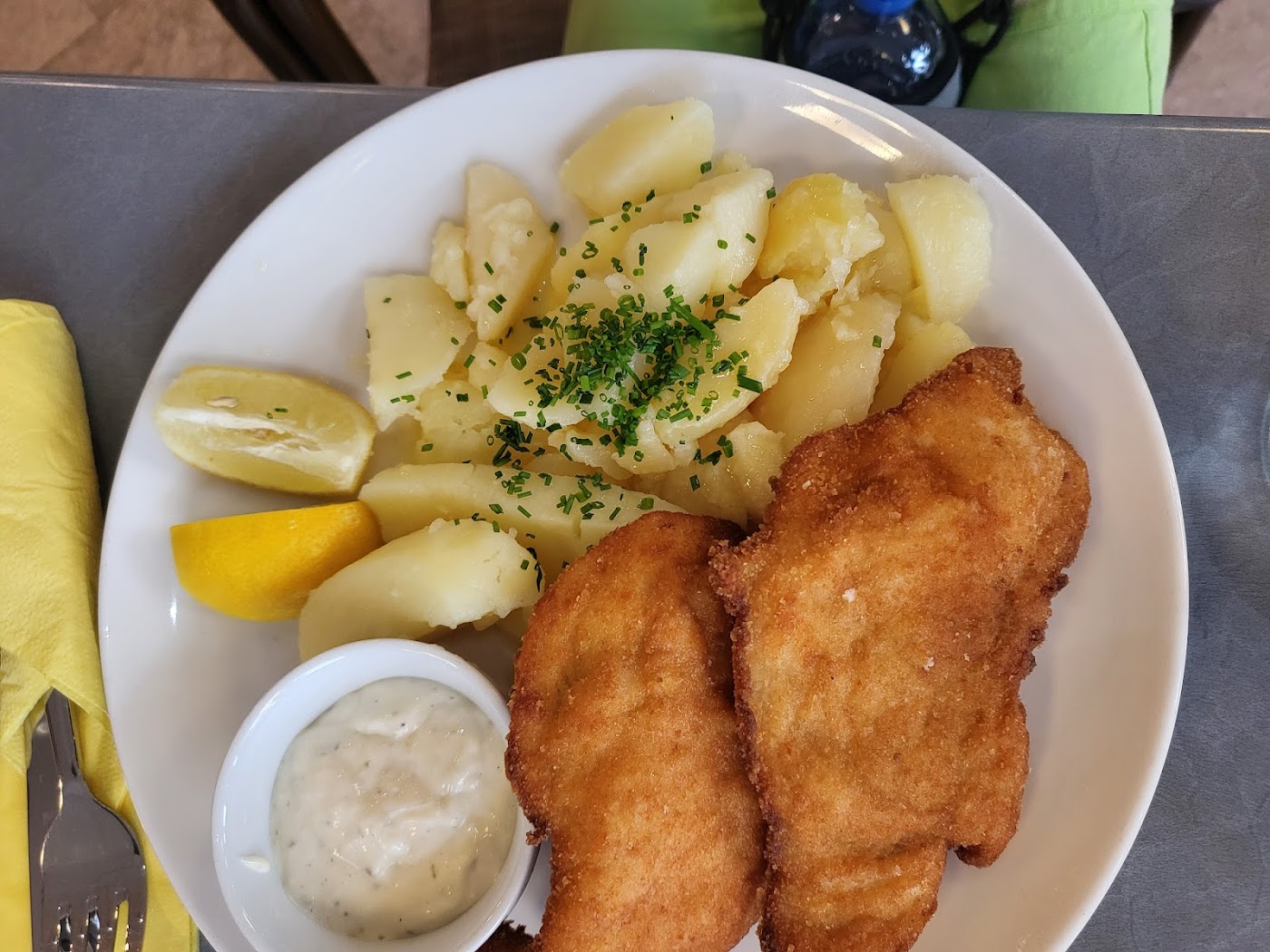 - Smažený řízek s vynikajícím bramborem a domácí tatarkou