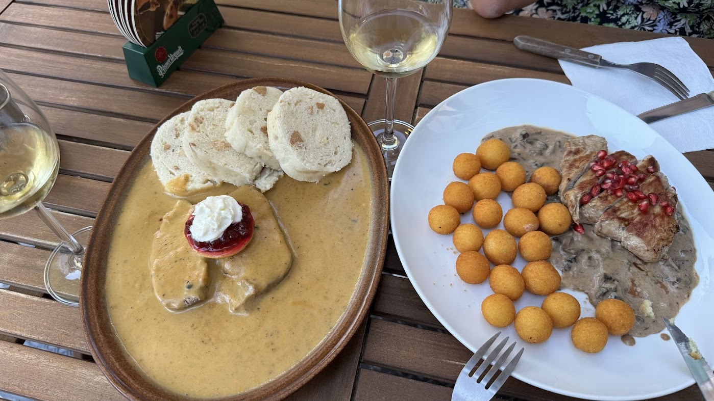 - Škvlé jídlo, zejména kulajda, farmářská pánev s bramboráčky a utopenec s chlebem