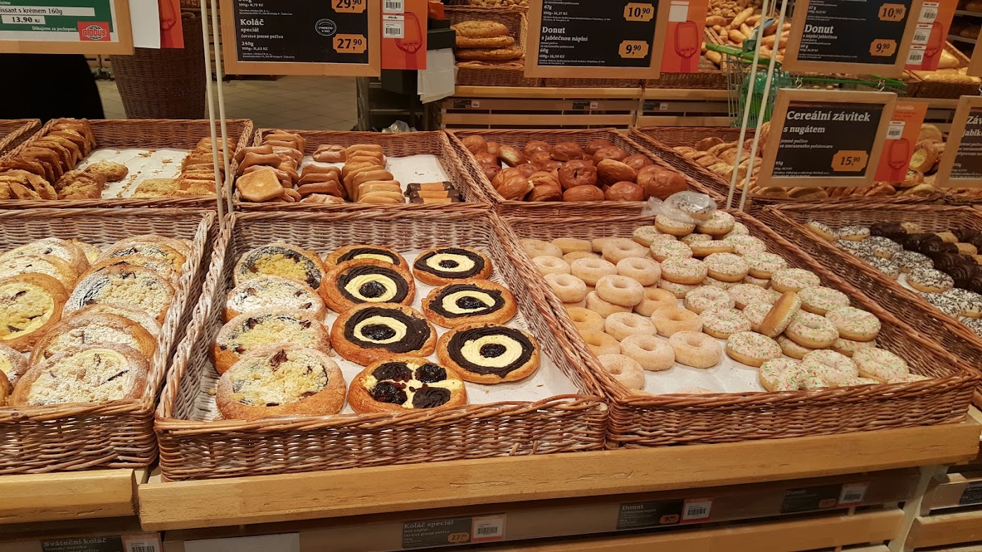 - Čerstvě napečené sladké a slané pečivo.
