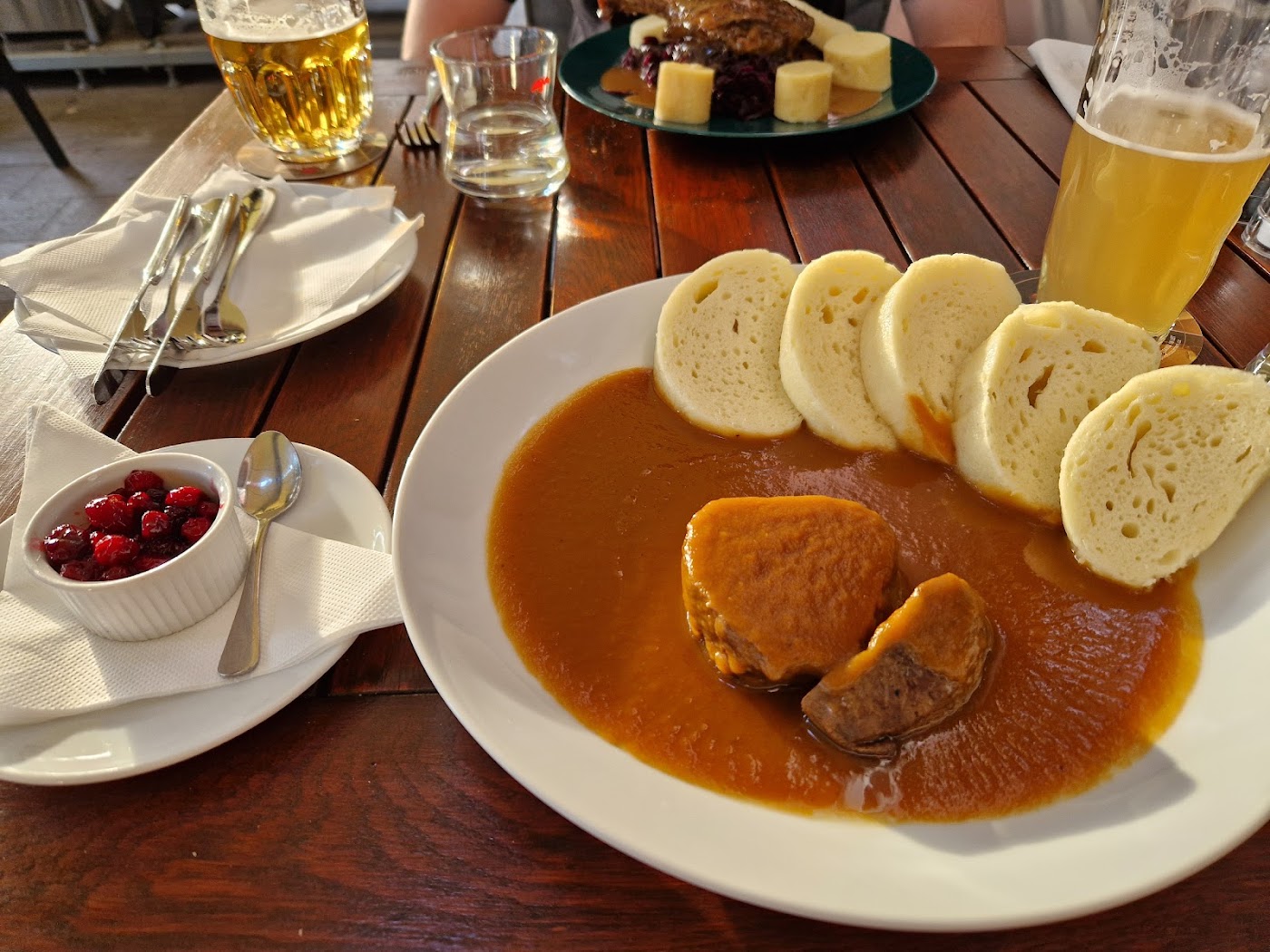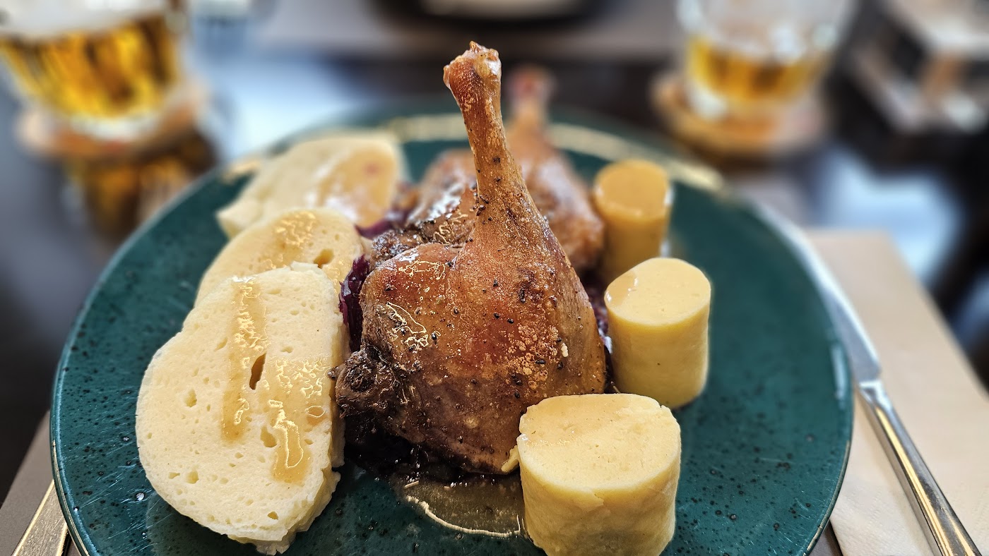 - V sádle pečený bůček s červeným a bílým zelím a bramborovým knedlíkem