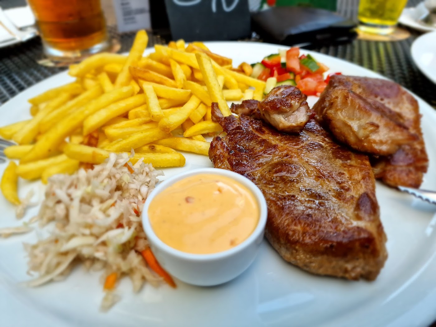 - Vepřová kotleta s pečenými bramborami a pepřovou omáčkou