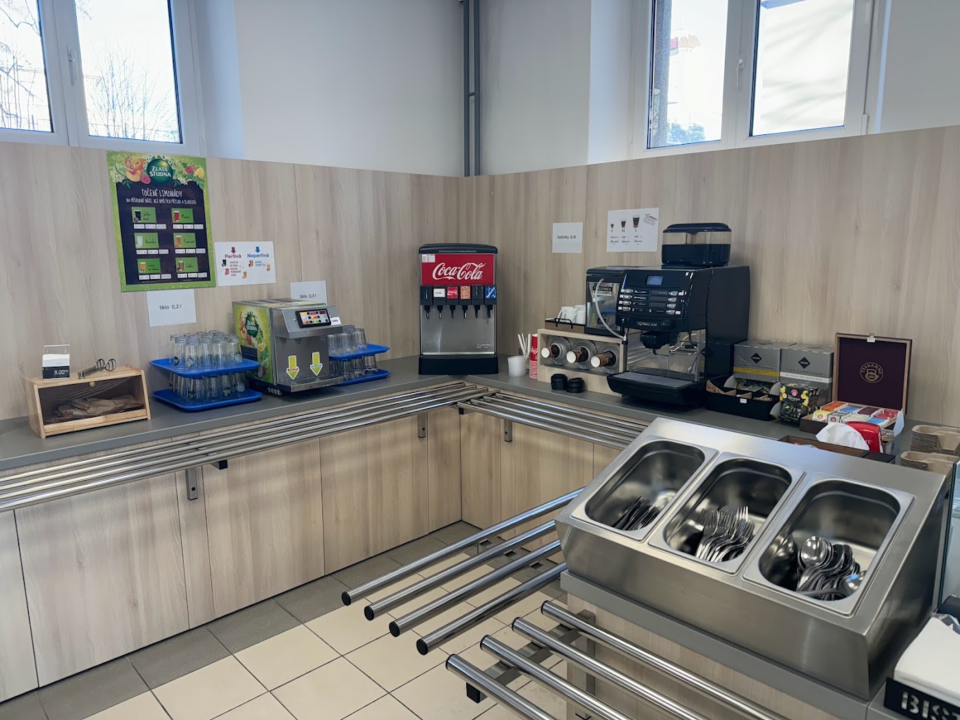 - Široký výběr jídel včetně dezertů a baget